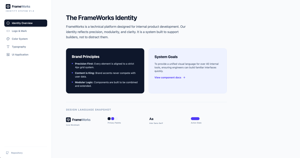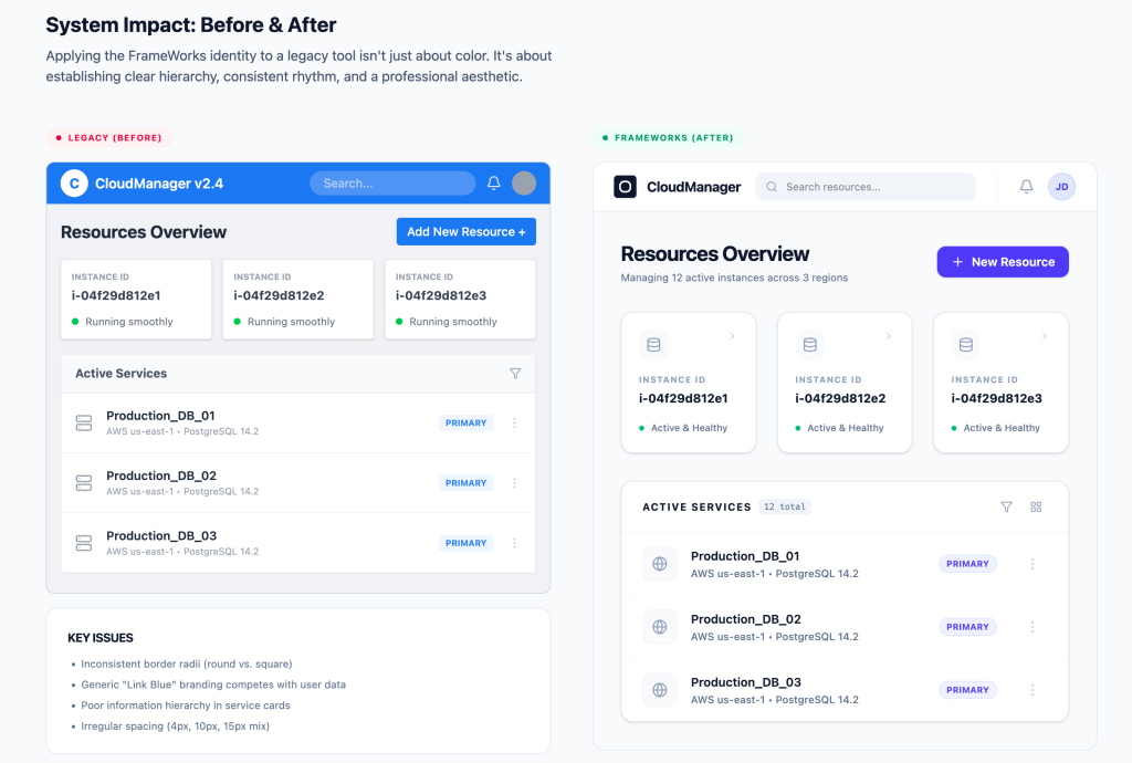 Evidence: Identity tokens, typography system, spacing rules, before/after system application