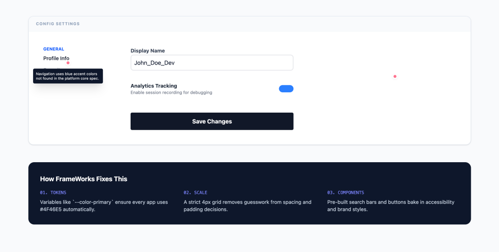 Different tools interpreted brand loosely. Hardcoded colors and inconsistent spacing created drift.