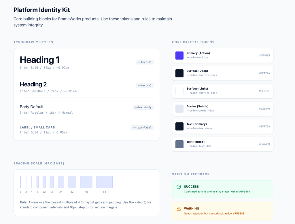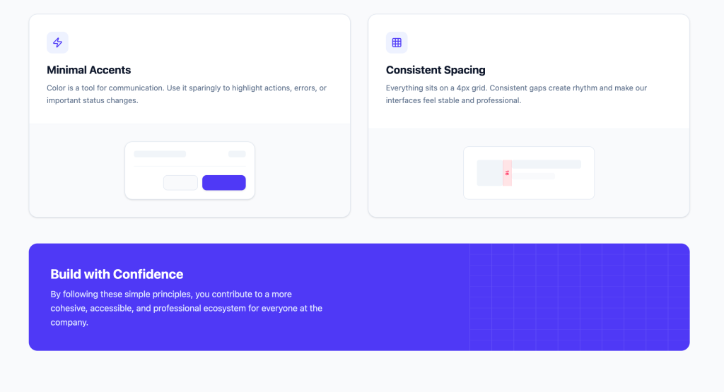 Minimal accents, strict 4px scale, and defined typography weights created rhythm and scan clarity.
