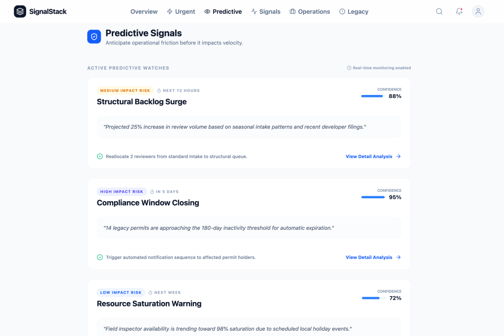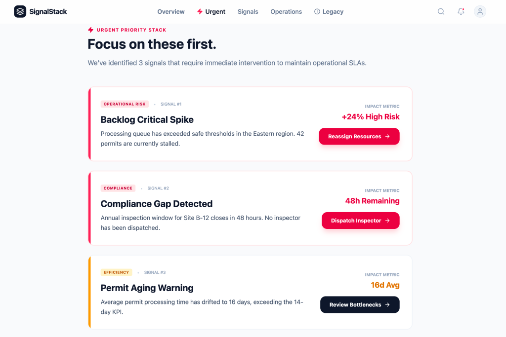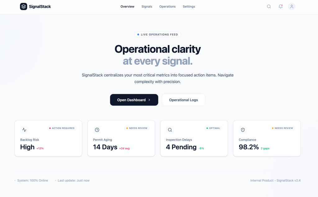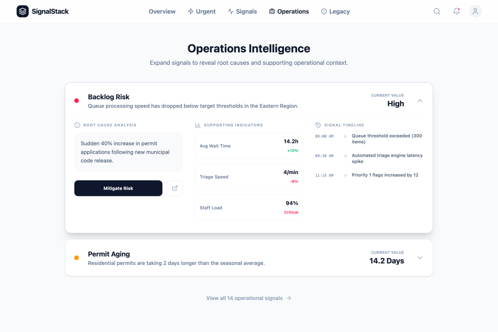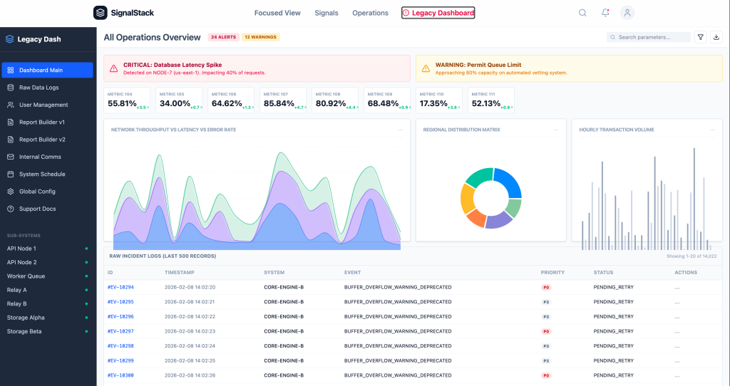 Data → InsightBy Whitney Cullens / January 9, 2026 Data → InsightTurning operational noise into clear signals IMPACT2.8h → 45m Average Response Time81% Faster Issue Detection86% Faster Mitigation Velocity98.2% Decision Accuracy94% Actionable Data Ratio74% Alert Fatigue Reduction Company: SignalStackFocus: Data prioritization & decision intelligenceContext: High-volume, time-sensitive operational systemsEvidence: Threshold modeling, signal layering, predictive monitoringSignalStack reframed dashboards as signal systems. Instead of reporting everything, the platform surfaces what requires action — and why. Teams had access to plenty of data, but struggled to identify what actually needed intervention. High-risk signals surfaced first, with context and direct next steps attached. Color, thresholds, and movement indicate change — not decoration. Every metric has a defined operational boundary. Drill-down preserves context. Teams see root cause, supporting indicators, and timeline in one view. Signals appear early enough to act on. The goal is prevention, not post-mortems. Reducing information density led directly to faster detection and more confident decisions.